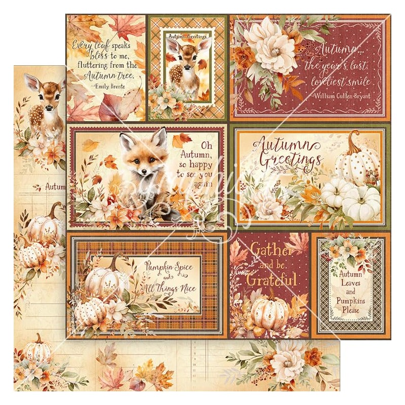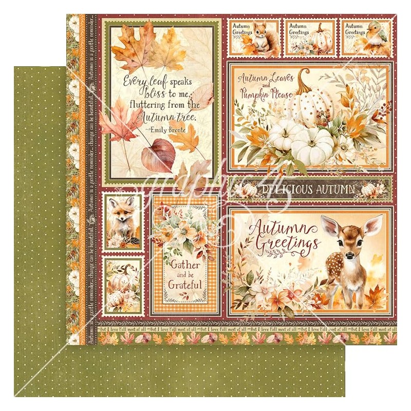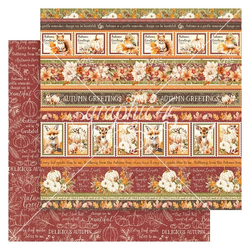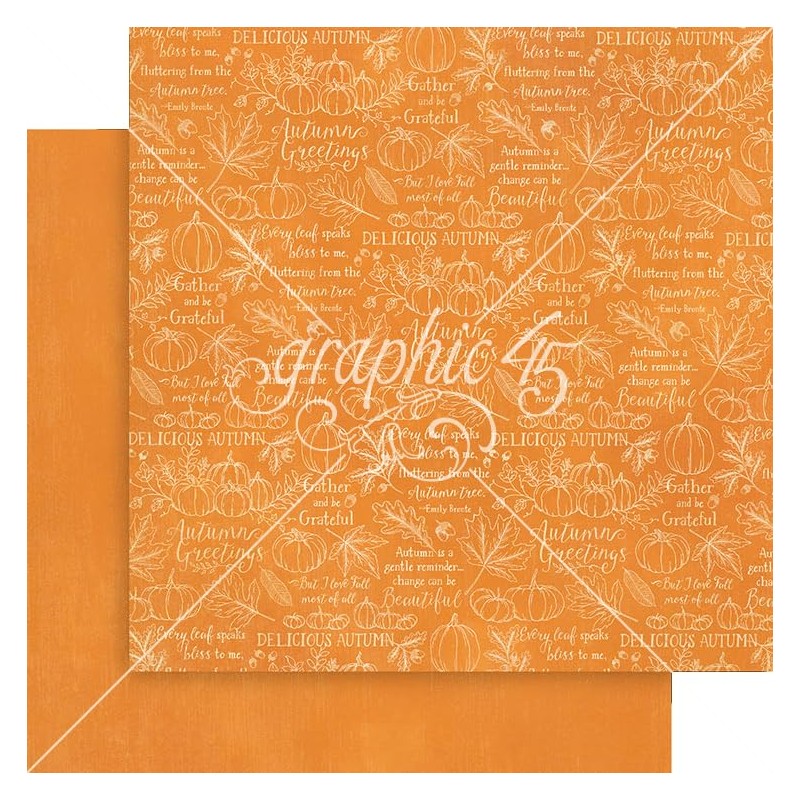 • Embrace the warmth and beauty of fall with Graphic 45’s “Autumn Greetings” paper collection. This enchanting set captures the essence of fall with a rich palette of olive green, burgundy, mocha brown, and pops of orange.