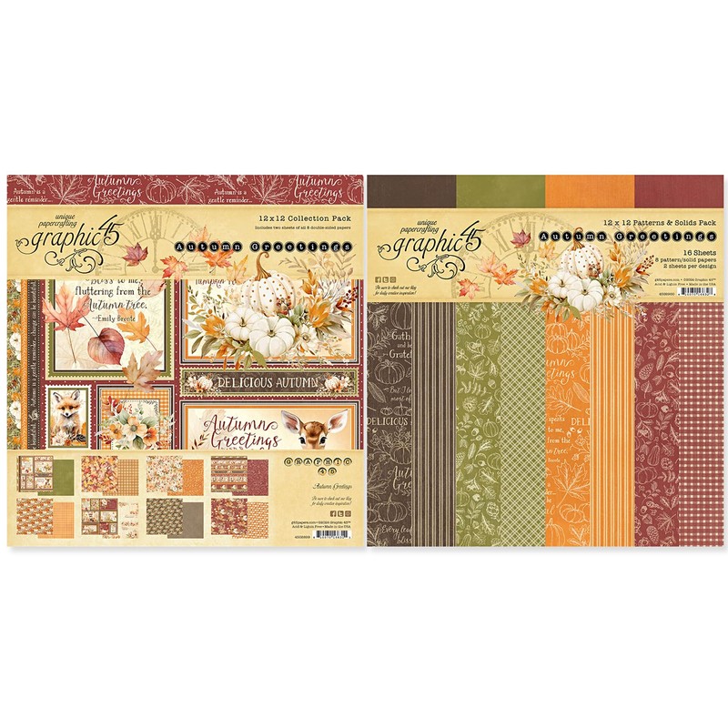 Graphic 45 Autumn Greetings Paper Pack and Patterns & Solids Pack - 12x12 Decorative Papers - 2 Items