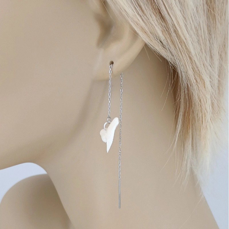 Grass Shack Trading SHARKS TEETH Ear Threads Threader Earrings Silver Pair Shark Tooth 4.5"
