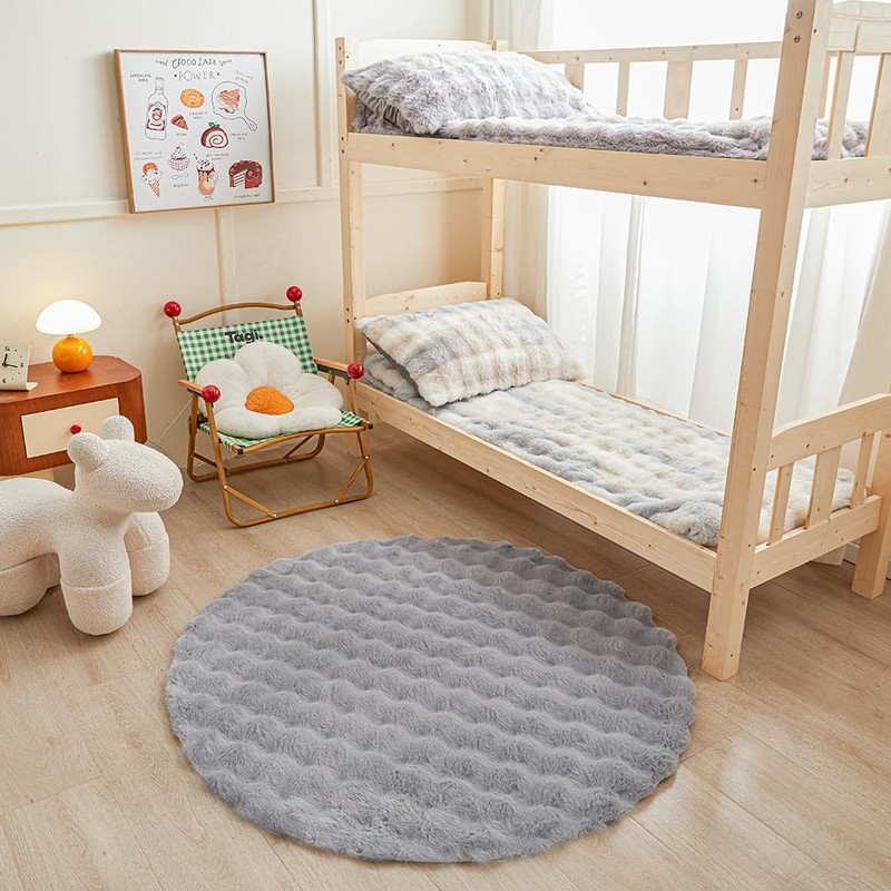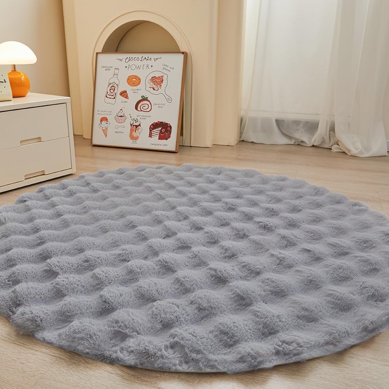 Gray Round Rabbit Plush Rug for Bedroom Living Room Sofa, 4'X4' Faux Fur Fluffy Shaggy Circle Carpet for Kids Teen Girls, Furry Circular Rug for Nursery Baby Room