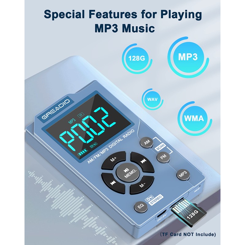 Greadio Portable AM FM Radio with MP3 Player, Best Reception Pocket Radio, Large LCD Screen and Easy to Use, 6 EQ Stereo, Earphone Jack for Jogging, Walking, Camping