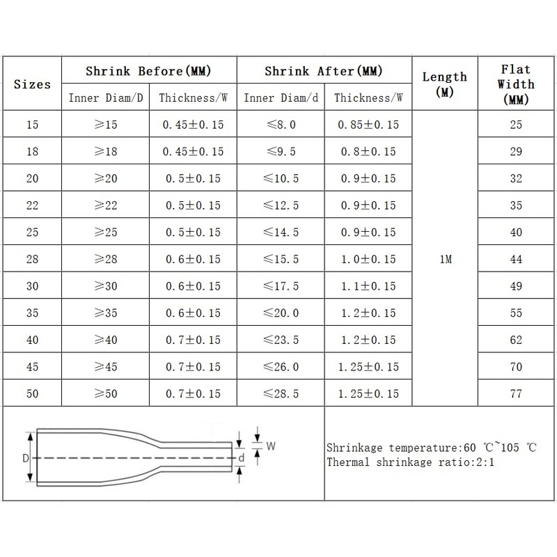 Thermal shrinkage ratio:2:1, Shrinkage temperature:60℃-105℃, Applicable temperature:-55℃-110℃, Environmental standard:RoHS.