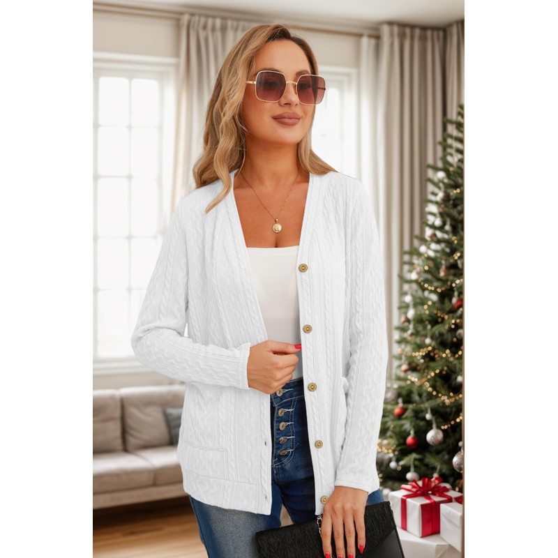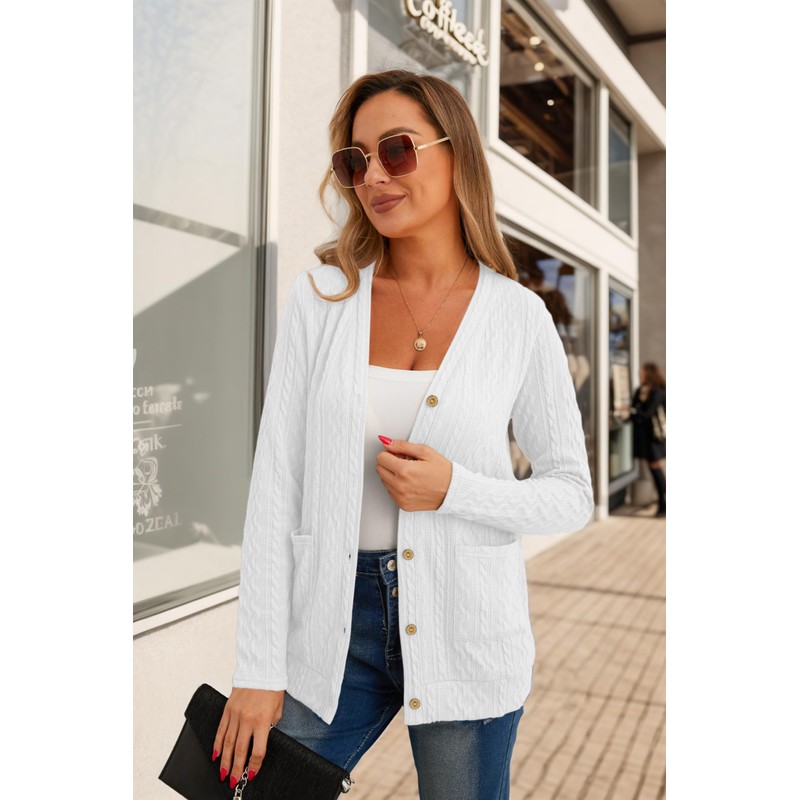 GRECERELLE Womens Lightweight Cardigan Sweater Long Sleeve Button Down Ribbed Knit Outerwear Open Front Tops with Pockets White-L
