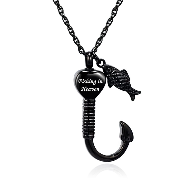 Gredstar Gone Fishing Urn Necklace for ashes Fish hook Cremation Urn Pendant Fishing in heaven Keepsake Jewelry (BLACK)