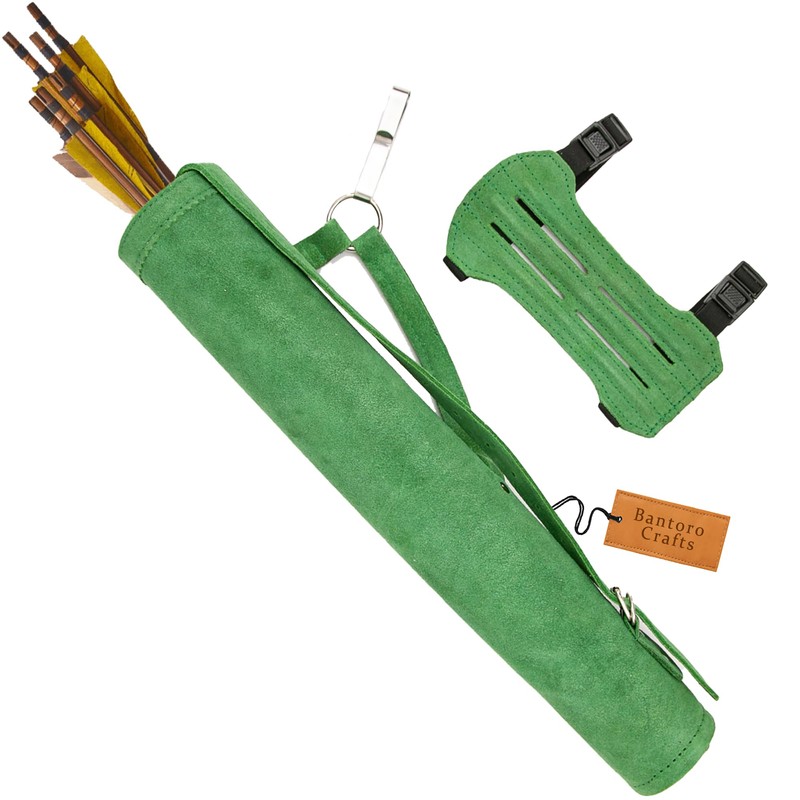 Green Bantoro Leather Archery Quiver with Matching Adjustable Arm Guard – Traditional Style Quiver and Elastic-Strap Forearm Bracer for Target Practice and Bowhunting