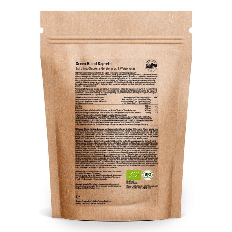 - Organic green blend capsules contain chlorella, spirulina, barley grass and wheatgrass from organic cultivation. No additives. Only pure nature.