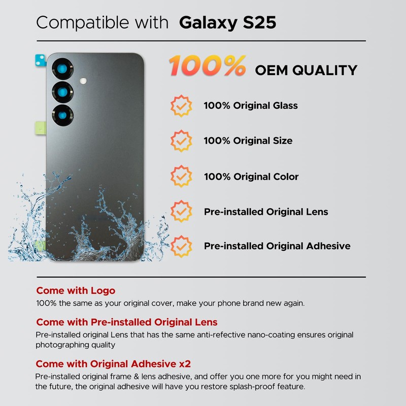 • 【Premium Original Quality, Perfect Match】Say goodbye to a cracked or scratched back! This Galaxy S25 back cover mirrors the original in quality, color, and fit. It comes with a pre-installed camera lens and pre-cut adhesive for an effortless installation that will make your phone look brand new.