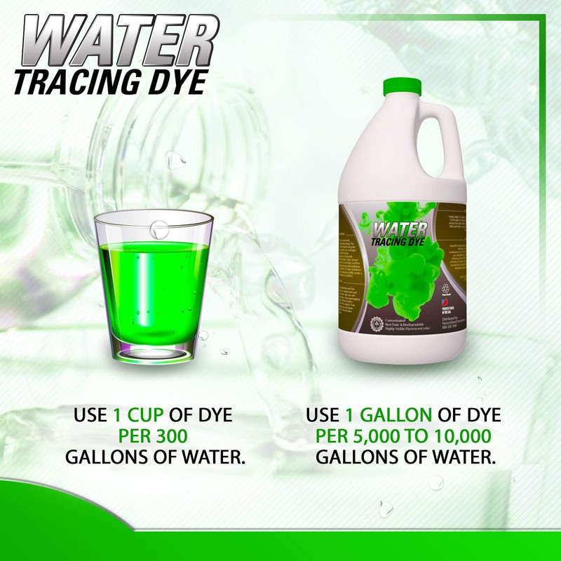 - HIGHLY DISTINCTIVE COLORANT (RED OR GREEN). This bright water tracing dye ensures maximum visibility under any condition. However, the dye can be traced more accurately under ultraviolet light or measured with a fluorometer.