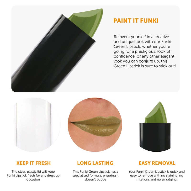 - PERFECT FOR ANY FANCY DRESS, MAKE UP, AND OUTINGS: Whether it be to complete a fancy-dress costume with some confident, proud Lipstick, completing looks for Halloween, or any other brilliant scenario you can think of, use our Funki Green Lipstick!