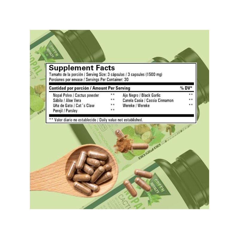 GREEN ROYALTY Nopal 7 Cactus Capsules – Herbal Blend with Aloe Vera, Cinnamon, Black Garlic & More – 1500mg per Serving – 90 Vegetable Capsules – Caffeine-Free, Sugar-Free, Non-GMO