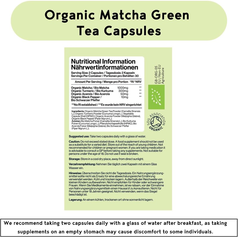 Green Tea on the Go: Naturally containing L-Theanine, our Matcha capsules offer the benefits of green tea wherever you are—at home, work, or on the move. Take two capsules daily with water after breakfast to support your health without discomfort.