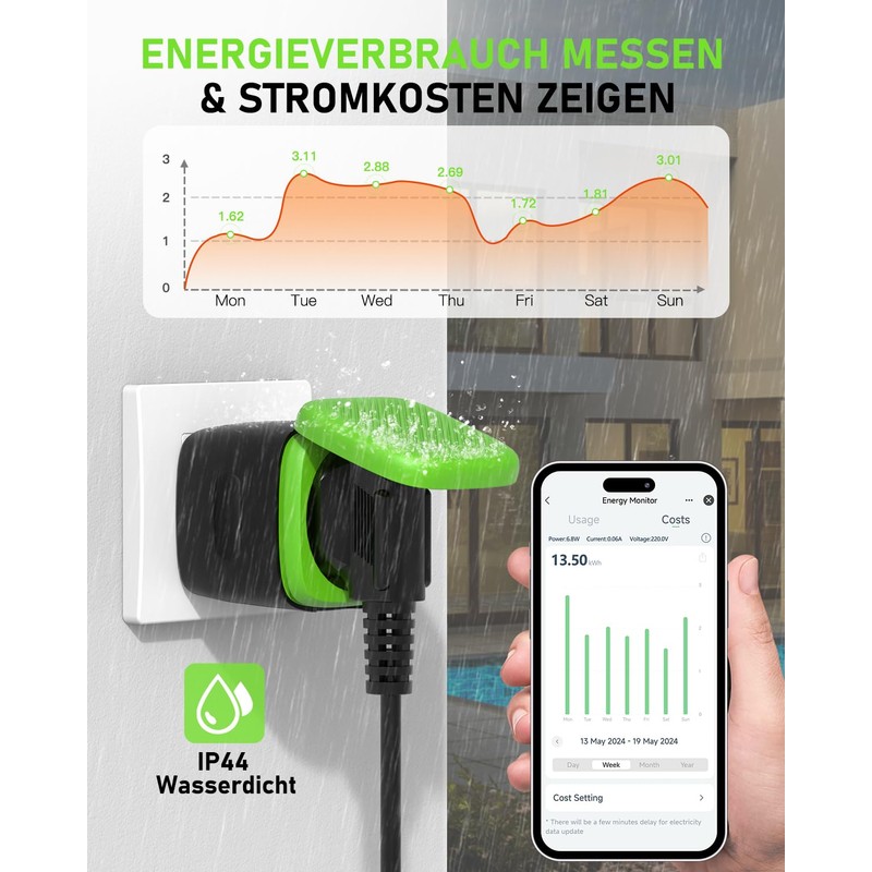 - Waterproof outdoor socket: the outdoor WLAN socket is easy to use and very practical. The robust construction of the socket ensures that it can withstand the adversity of the weather. Its waterproof design ensures reliable use in rain, snow or strong temperature fluctuations. You can use the socket to control the pool pump, garden fountain, garden pump, Christmas lighting or other electrical devices.