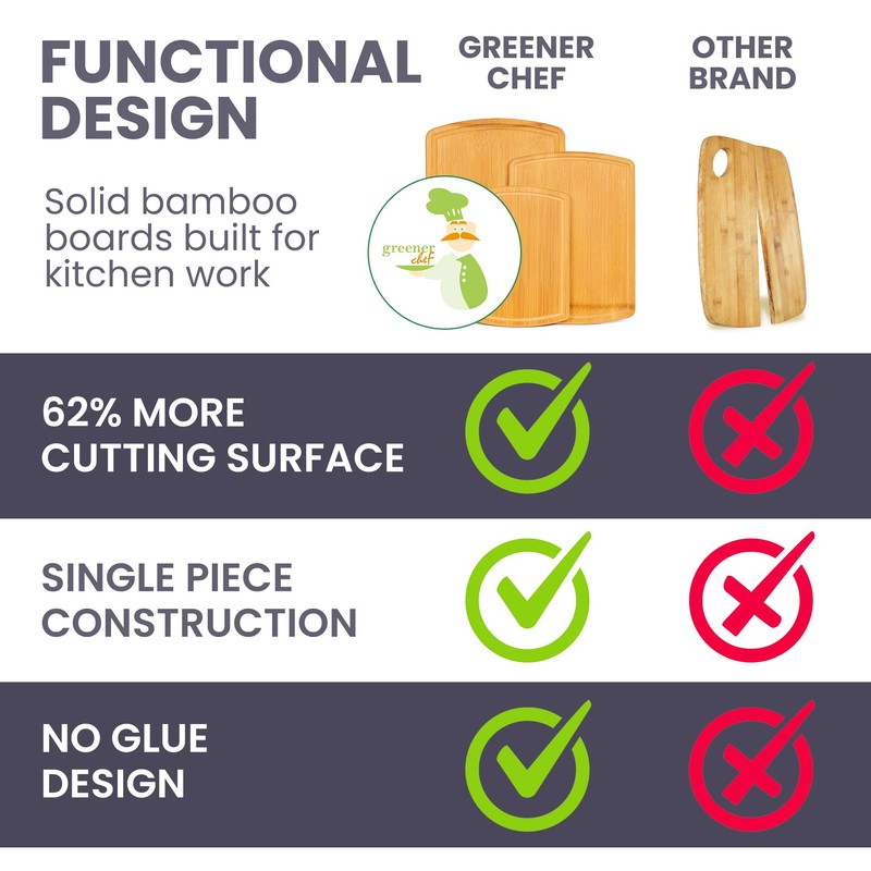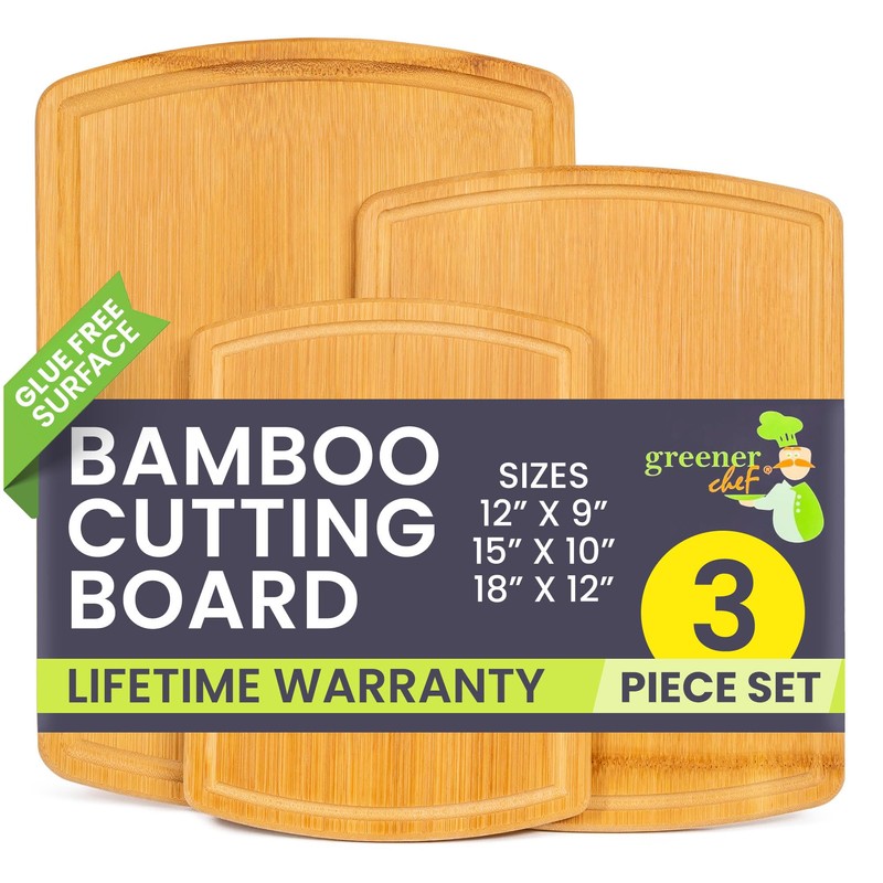 - Experience pure meal prep with Greener Chef's single-piece bamboo cutting boards. Each board features a continuous bamboo surface with no glues or adhesives, ensuring a safer, cleaner surface for chopping, slicing, and dicing. Enjoy peace of mind knowing your food never touches harmful substances.