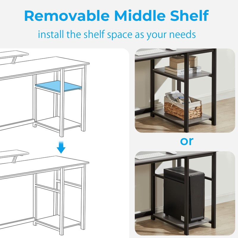 - REVERSIBLE STORAGE SHELVES: Computer desk with 2-tier storage shelves can be installed on left or right side according to your space or use habits.Open shelves can hold your books,storage box etc.You can remove the middle shelf to get more space for large computer tower.