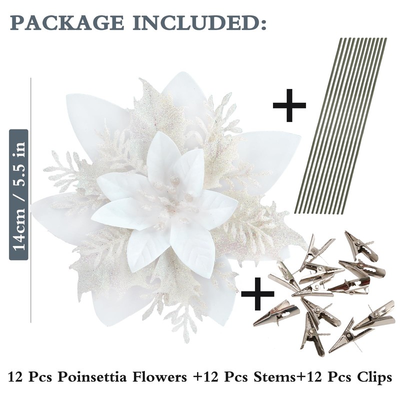 - Package Include: 12 pcs Christmas glitter poinsettia flowers + 12 pcs metal clips + 12pcs stems