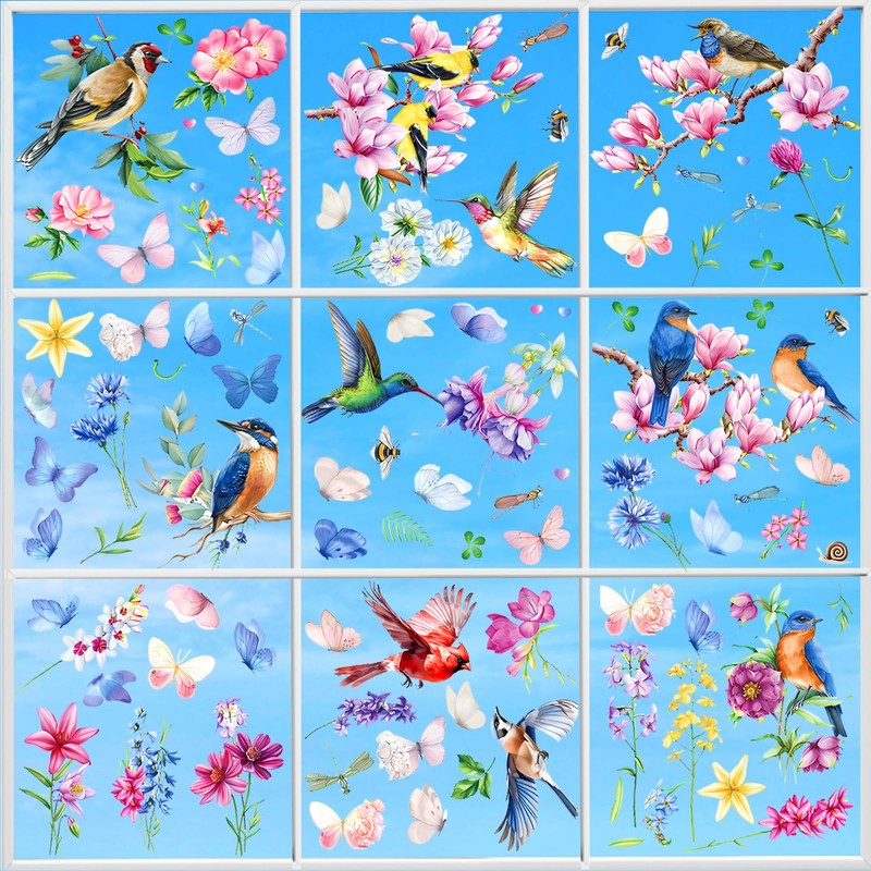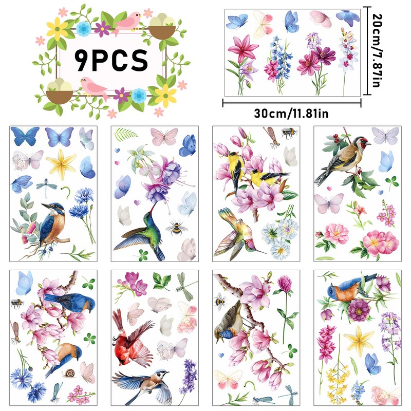GreenYeah Window Stickers Spring, 9 Sheets Spring Birds Window Pictures, PVC Window Stickers, Spring, Birds, Flowers, Small Animals, Butterflies, Window Stickers, Spring Summer Window Decoration (A)