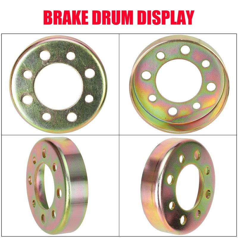 - PRODUCT FEATURE AND EASY TO INSTALL—this brake band does not attach directly to the axle,so it would theoretically fit any size live axle.The brake drum has universal mounting hole pattern with both 5/16" & 3/8" bolt holes -- those 8 bolt holes will hopefully match those on you wheel brake hub.There is a hole on either end of the brake band.One end fastens to a stud mounted on the cart, but is still able to pivot,and the other end fastens to your brake rod.