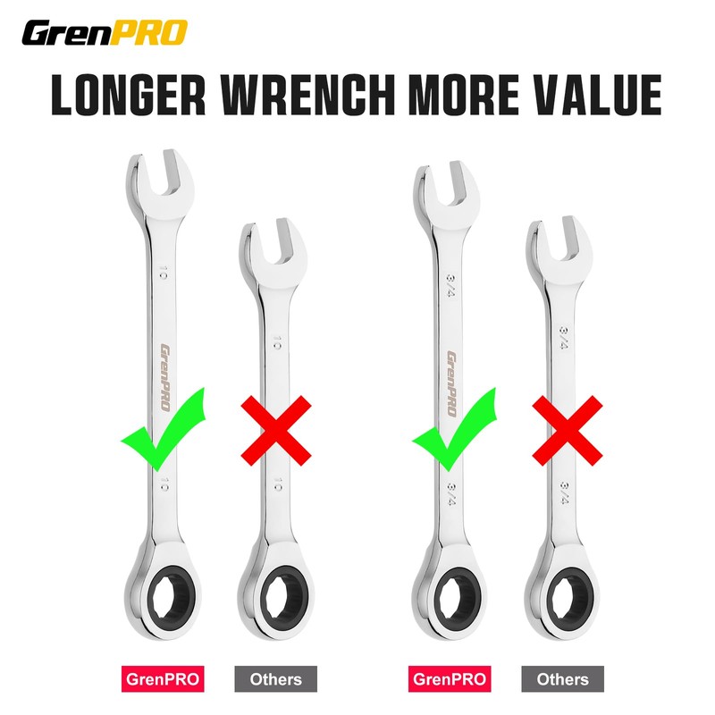• 12-Point,72-Teeth Hand Tools Sets:GrenPRO Ratcheting Wrench features 72 teeth gears and 12 points full-drive box end. 72 teeth ratchet gears need only 5 degree working swing arc, suitable for tight space. 12-point full-drive box end offers firmer grip and more reliable torque to tighten and loosen any bolt or nut easily and more effortlessly without rounding