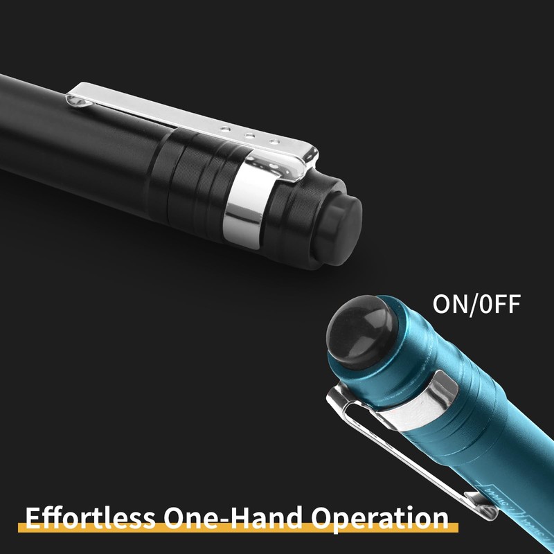 LED Flashlight Set of 4 Black 4-Pack LED Pen Lights – Nurses, Pros & Adventures 1. 32g Ultra-Light: Clip to scrubs, pockets, leashes – effortless carry. 2. Batteries Included: 8x AAA (2 pre-installed) – ready to use. 3. One-Handed Control: Oversized switch works with gloves; no fumbling. 4. Durable Aluminum: Water-resistant, drop-proof for hospital, hikes, emergencies. 5. 4 Stylish Colors: Pink, Red & more – ideal for gifts, kits, daily carry. 150-lumen beam, 2-hour runtime. 4 lights, 8 batteries – never miss a beat!