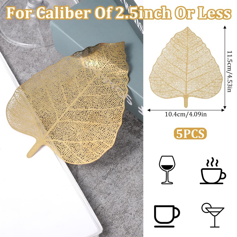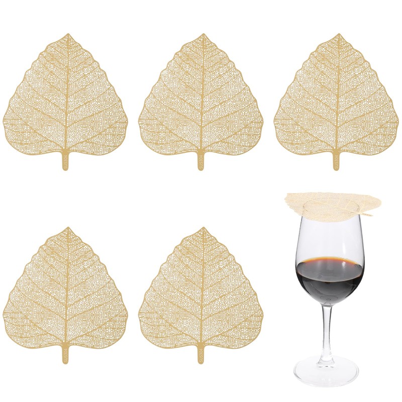 Grevosea 5 Pcs Cup Covers for Drinks for Safety, Ventilated Stainless Steel Wine Glass Covers Leaf Shape Drink Cover for Outdoor Wine Glass Picnics and Party Dinners (Gold)