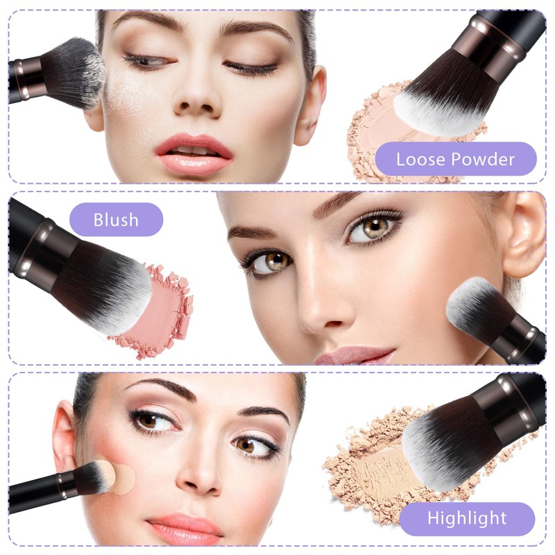 - High-Quality Brush Hair: Our kabuki brush is crafted from premium synthetic fibers that are soft and gentle on your skin. This retractable makeup brush provides full coverage for foundations, highlighters, bronzers, and blush, helping you achieve a great makeup look every time