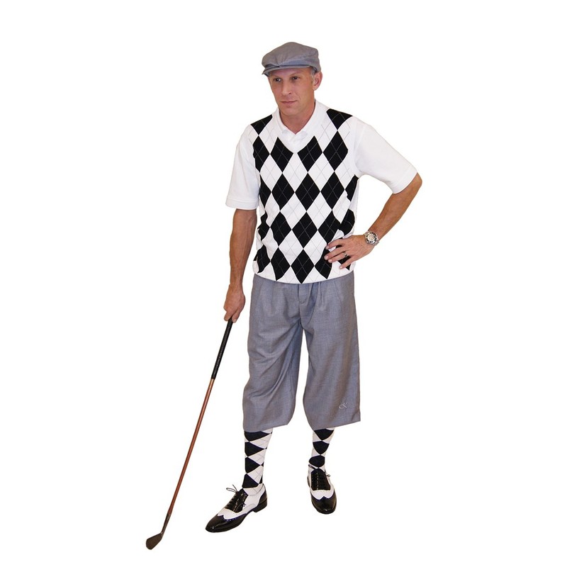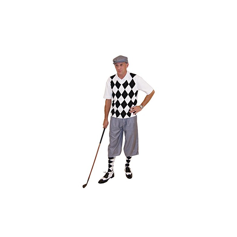 A golf outfit complete with Silk Touch Golf Knickers, vest, cap, tie and socks. Knickers are fabricated using a blend of wool, cotton and silk giving them a soft hand and beautiful luster. Our solid plus-four golf knickers epitomize sharp simplicity and provide tremendous comfort from the first to the eighteenth hole offering a partial waistband for greatest comfort. The hem closure utilizes the classic buckle design to give the most adjustable fit. Machine washable.