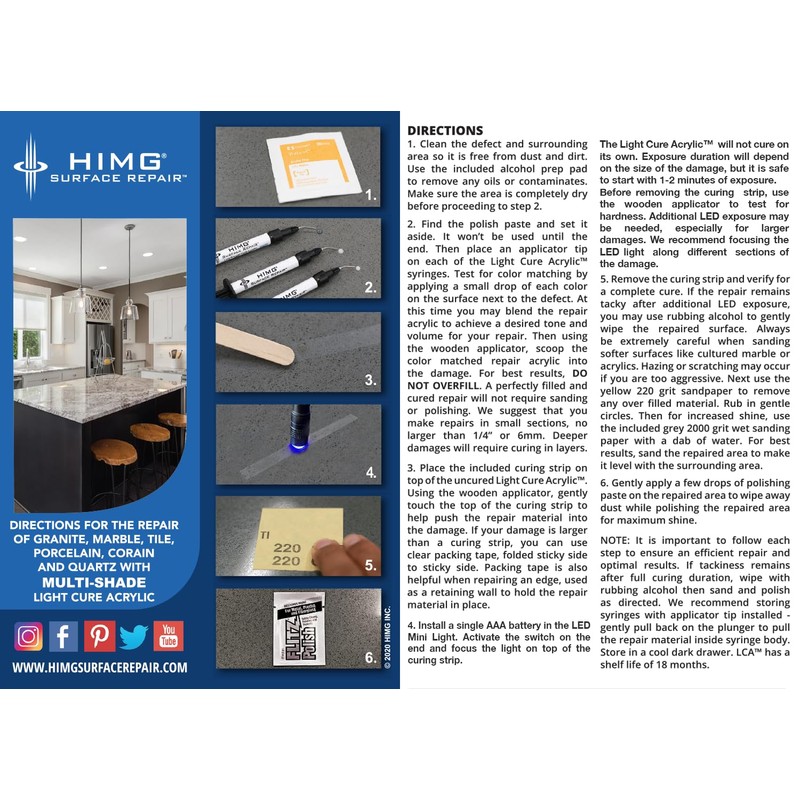 - Versatile Kit: Repair chips, cracks, and deep scratches on quartz, granite, marble, Corian, porcelain, acrylic surfaces, and more.