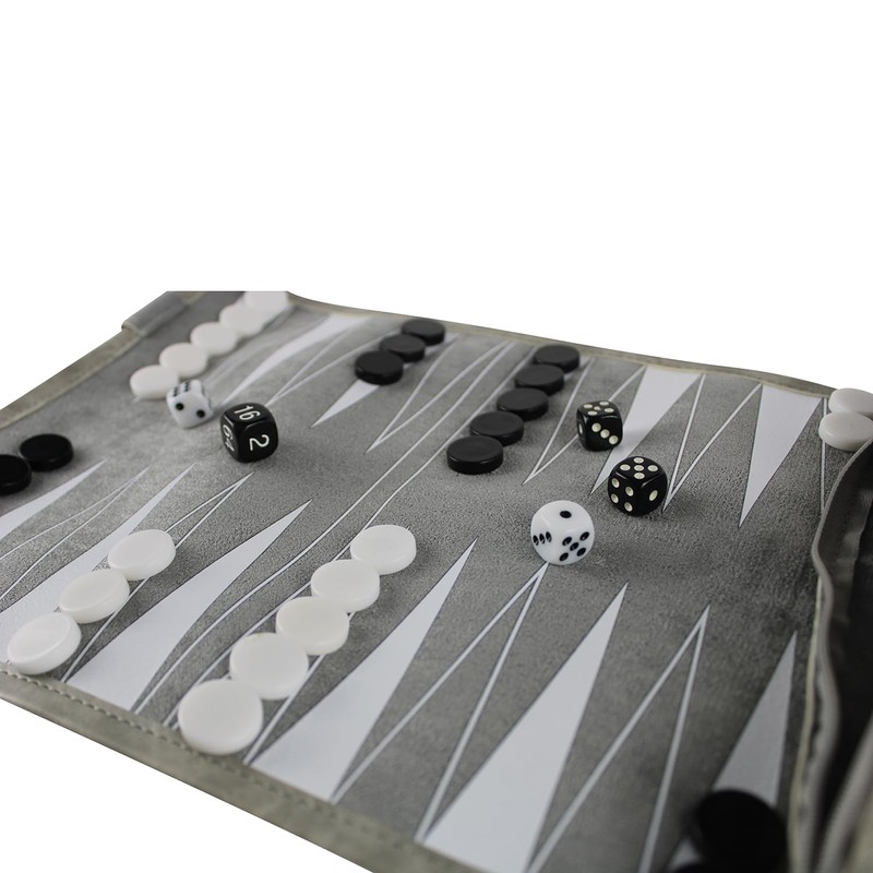 - Introducing our versatile and travel-friendly Grey Leatherette Roll-Up Backgammon set. Designed with your convenience in mind, this compact 13-inch board is perfect for on-the-go gaming.