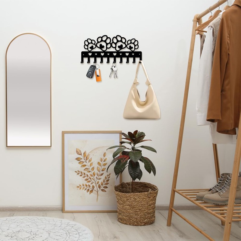 Greyoe Key Rack, Key Holder, Key Board Hook, Wall Key Holder with Hooks, Wrought Iron, Keychain, Key Hook, Metal Art Ornament Black (Dog Paw Print)