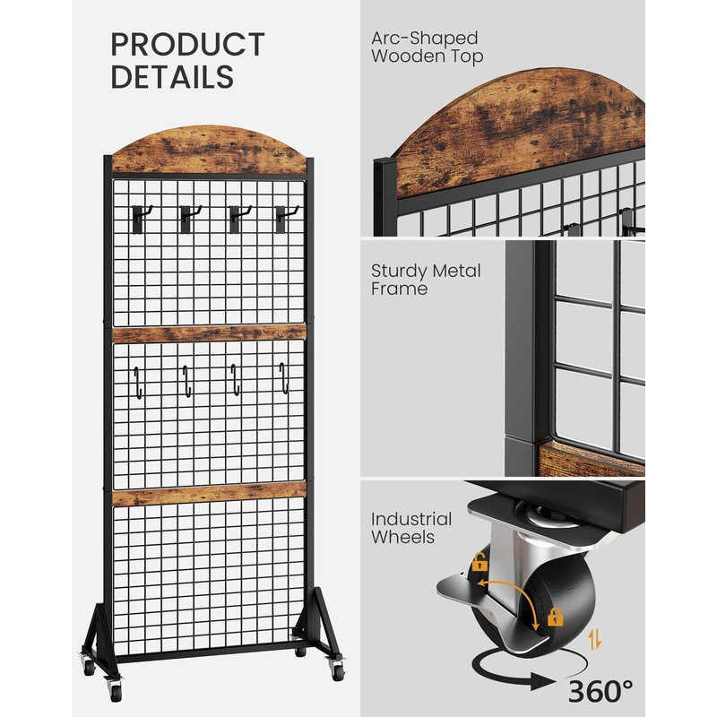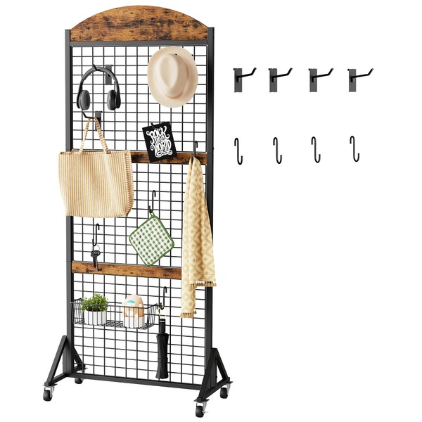 Grid Wall Panel 5.7’ x 2’ FT Grid Display Rack, Movable Gridwall Display Stand, Sturdy Floorstanding Wire Grid Rack, Rustic Brown and Black TCJ17BF
