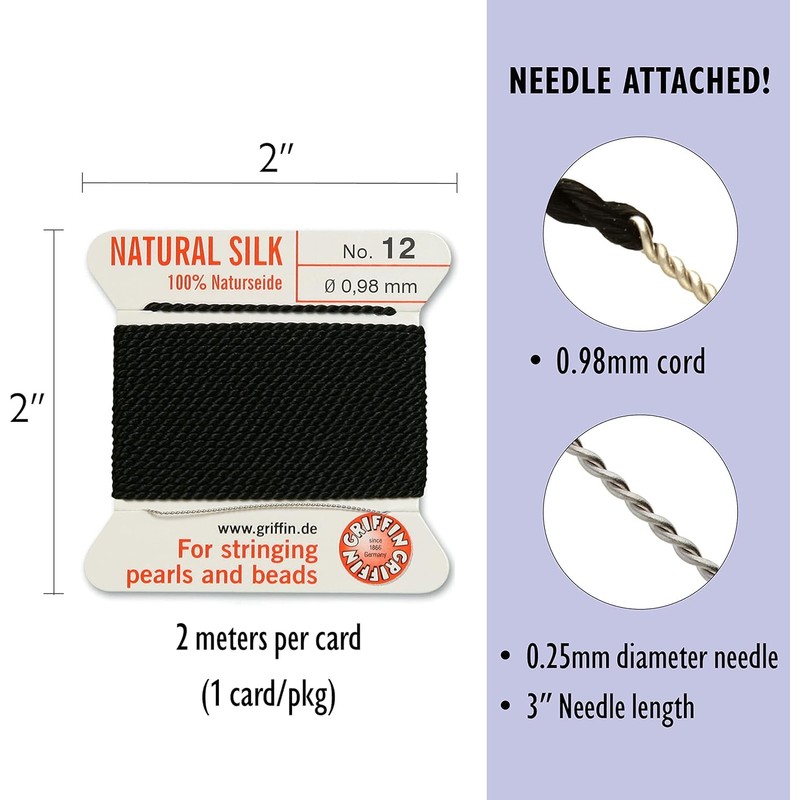 - Each card features top-quality German-made Griffin bead cord. This is the finest quality tight-woven silk cord available with 6.5 feet (2 meters) of brilliantly died, color-fast cord per card with needle attached. Simply take the needle from the card and off you go! The twisted stainless steel needle saves threading time. Doubling the thread is not necessary. There is no simpler, no quicker, and no better way to thread beads.