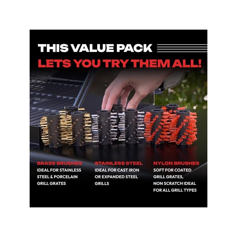 - 3 TYPES OF REPLACEMENT BRUSHES – Choose from a nylon, brass, or stainless-steel grill brush so you can test what works best for your grill without harming the surface of your grates. Replace brushes after 50 uses.