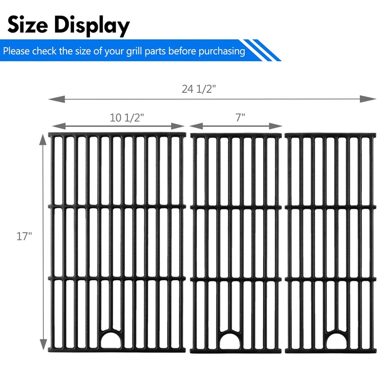 - 【Package and Size】 Come with 3pcs charbroil 463365021 grill parts, pack of 3, includes 1pc 17" L X 10 1/2" W wide charbroil performance replacement grate, 2pcs narrow 17" L X 7" W 463365021 grill grates, in total 17" L X 24 1/2" W. 【Please Note】 Please compare with the size and original part number before order to find the right char-broil performance 4-burner gas grill replacement grates.
