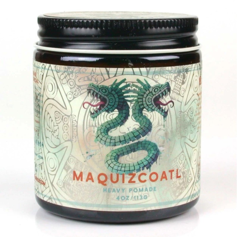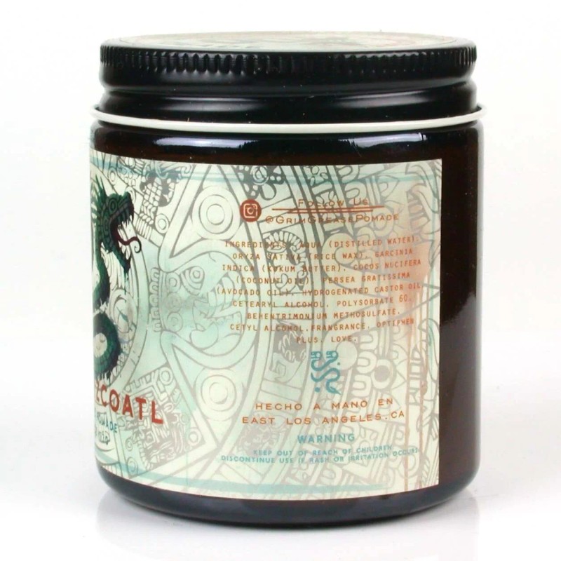 Maquizcoatl Pomade was specifically formulated to withstand tropical/high heat environments. It gives heavy to xtra heavy hold with a low to medium shine. Easily re-combable. Washes off with just water. It can be applied to both dry or towel dried, damp hair. just have in mind it’ll have a little tug if applied on dry hair. Grim Grease added their new fragrance Serpent blend that consists of fruity, floral notes followed by semi green and woodsy base notes. It’s Clean. bright, and refreshing. Coatl, meaning serpent, is a sculpture created by the Aztecs found in the British Museum. Very little is known of this Serpent but it has been proposed that the serpent was a symbol of rebirth because of its ability to shed its old skin and appear as a reborn snake. 4 oz. Made in the U.S.A.