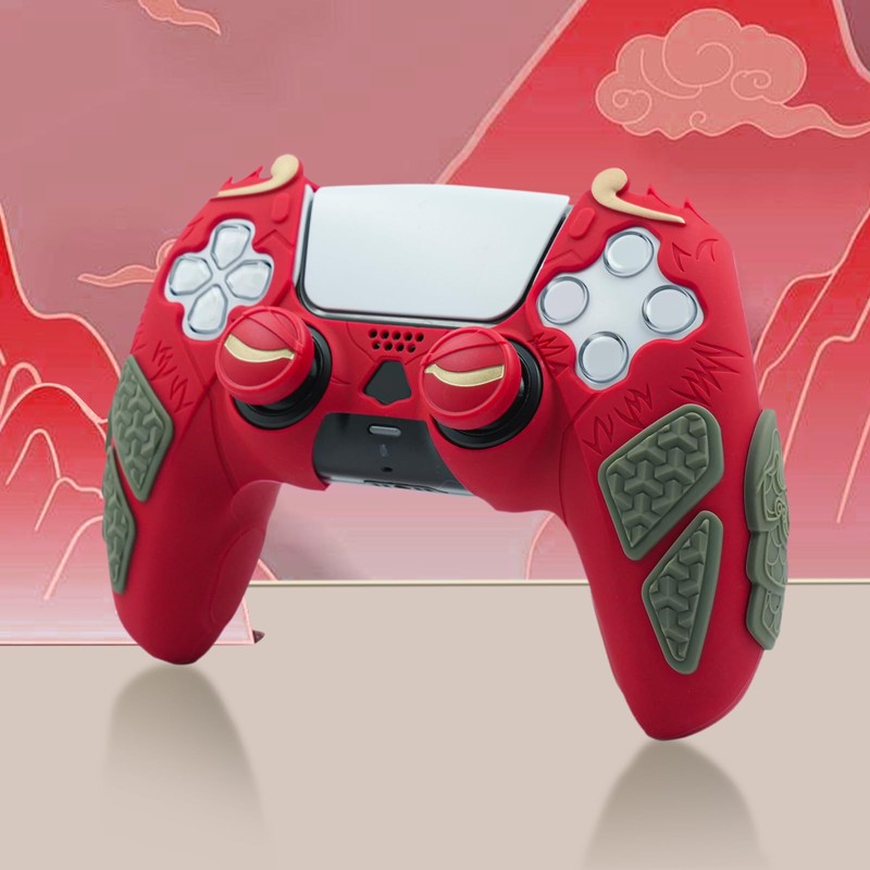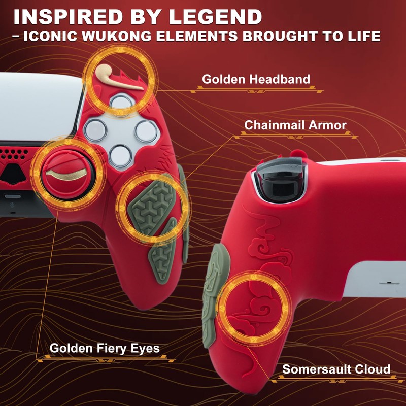 Grip Cover for PS5 Controller, Wukong-Inspired Ergonomic Silicone Cover with Fiery Eyes Joystick Caps, Chainmail Grip Design & Somersault Cloud Back (Red)