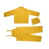 - Three piece pvc with polyester lining jacket, bib overalls, and detachable hood