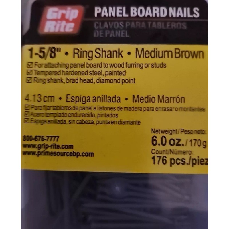 This pack of Grip-Rite panel board nails features 176 pieces of 1-5/8" ring shank nails that are perfect for any home improvement project. The nails are made of temper hardened steel and are painted a medium brown color to blend in seamlessly with your project. The brad head style provides a secure hold and the nails are measured in inches.