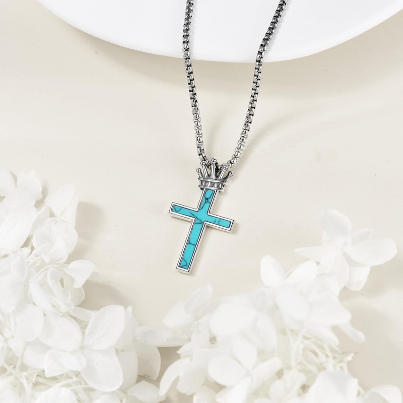 Grmdit Cross Necklace with Crown 925 Sterling Silver Turquoise Cross Pendant Necklace Turquoise Jewelry Gifts for Men Women