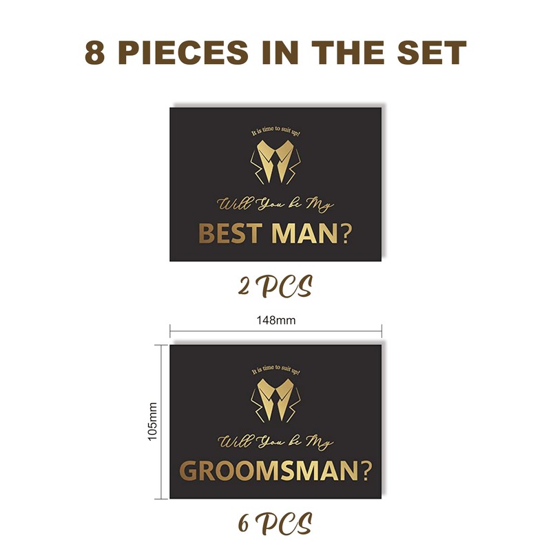 - GROOMSMEN PROPOSAL CARDS SET : Each set contains 6 Will you be my groomsman proposal cards and 2 Will you be my best man proposal cards with matching white envelopes.