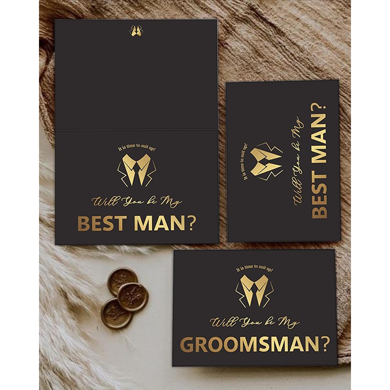 - HOT PRINTING PROCESS : These best man and groomsman invitation cards are made of 250g kraft paper, thick and not easy to tear. Compared with other ordinary groomsmen cards, our groomsmen cards use a gold stamping process to make the invitation look simple yet luxurious.Matte finishing appears to very elegant and give you a comfortable touch.