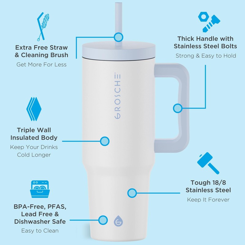 GROSCHE Aspen 40 oz Tumbler with Handle and Straw. Extreme Insulation, Classy Design, Built to Last Insulated Stainless Steel Tumbler with Handle, lid and Straw - Frost White