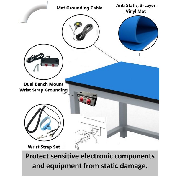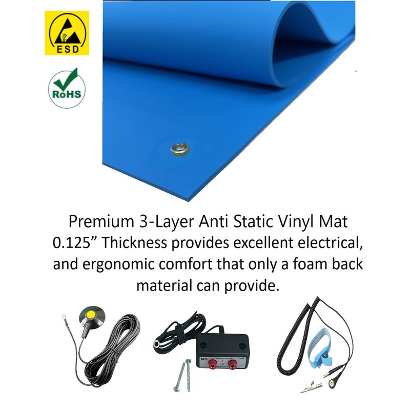 • High-Quality Construction: The mat is crafted from 0.125" thick three-layer dissipative vinyl with a foam back to enhance ergonomic comfort; a wrist strap, grounding cord, and dual bench grounding are included