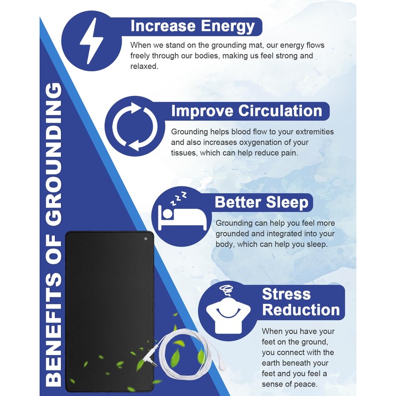 - Benefits : Grounding reduces inflammation, which improves the quality of sleep,and grounding helps to increase circulation, making you feel more relaxed and energized. When we are on our feet, our energy flows freely through our bodies, making us feel strong and relaxed