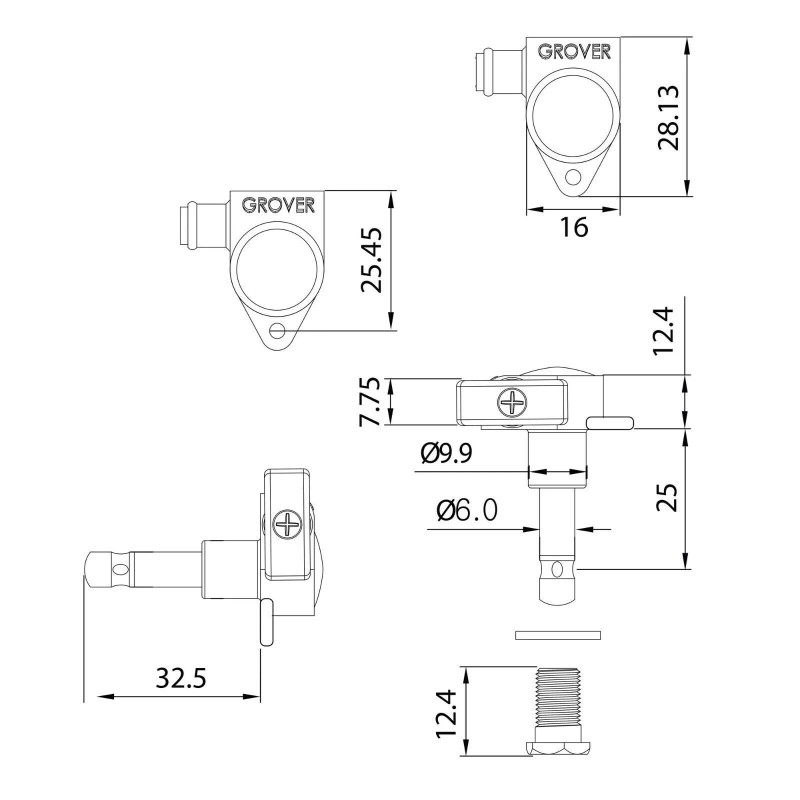 Grover Locking Rotomatics® gives you the ease of use provided by a standard tuner and the positive locking of our internal cam post. Simply insert the string through the string hole, pull to tension by hand, and begin tuning. As you start to tune, only the locking cam in the string post turns. Once the string is locked, the string post begins to turn, allowing you to bring the string to pitch. In less than one revolution of the string post, you will be in tune, to stay in tune.