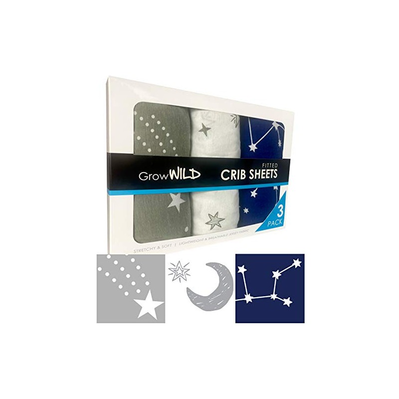 GROW WILD Crib Sheets for Boys or Girls | 3 Pack Soft Stretchy Jersey Cotton Fitted Crib Sheet Neutral | Grey White Navy Blue Baby Crib Sheets for Girl, Crib Mattress Sheet or Toddler Bed Sheets