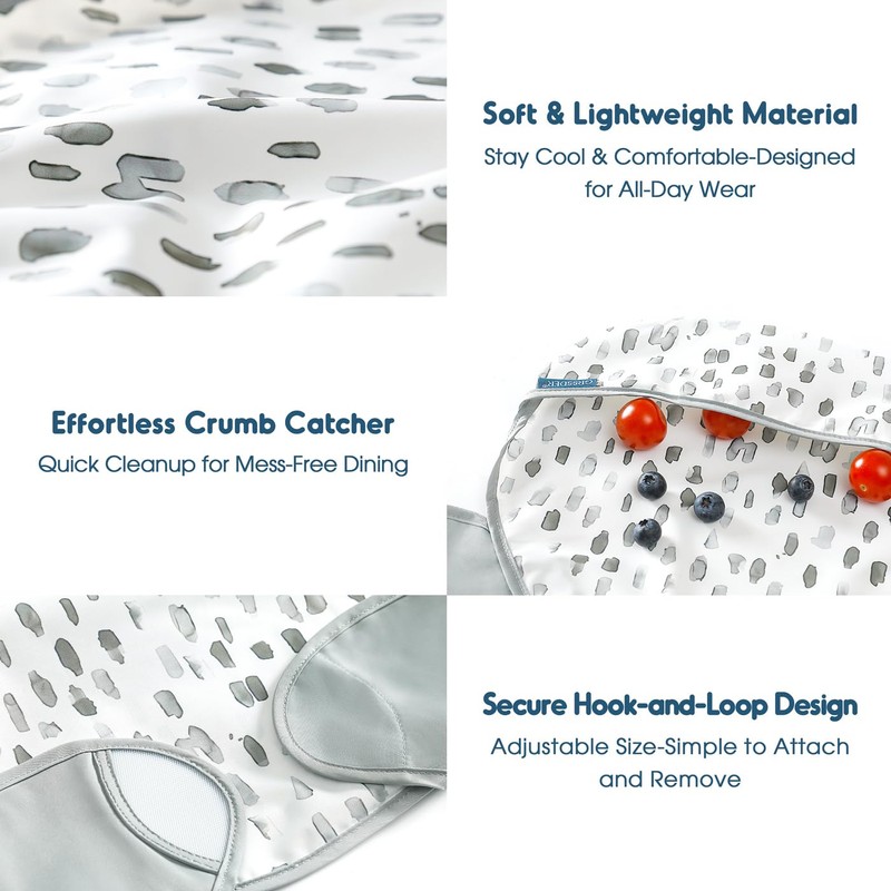 The dual-layer construction features a durable, food-grade waterproof fabric that blocks liquids. No more surprise leaks! It's waterproof and stain resistant, wipes clean in seconds. The deep, wide pocket acts like a superhero cape for catching crumbs, yogurt splatters, and runaway Cheerios, keeping floors (and your sanity) intact.