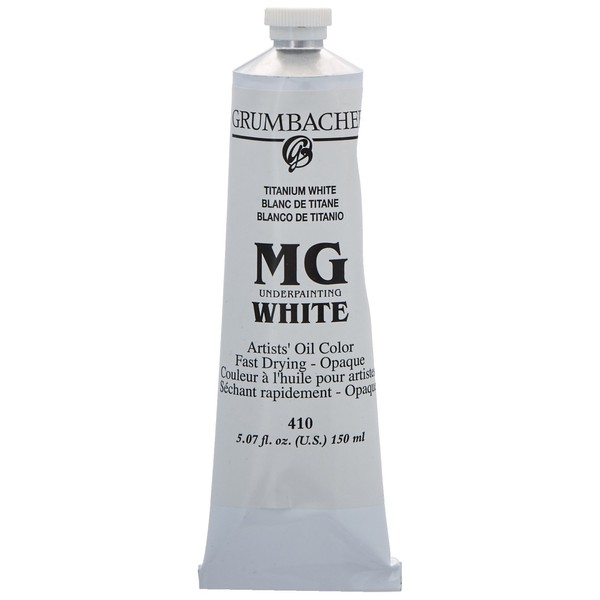 This permanent, fast-drying Titanium White oil paint is designed for use in underpainting or in wet-on-wet (alla prima) painting. Specifically formulated to create a lean, dry paint film, MG Underpainting White has enough tooth to readily accept glazes. Other uses include creating surface textures and impasto techniques. In normal applications, MG Underpainting White dries to the touch in 4 to 6 hours and may be painted over immediately. Need to control drying time? Mix MG Underpainting White with oil colors or mediums. To dilute, mix it with Pure Gum Spirits of Turpentine or Grumtine only. Petroleum solvents and paint thinners and odorless paint thinners are not compatible with this product. Mixtures of MG Underpainting White in excess of 1:1 will result in a brittle, dry paint film.