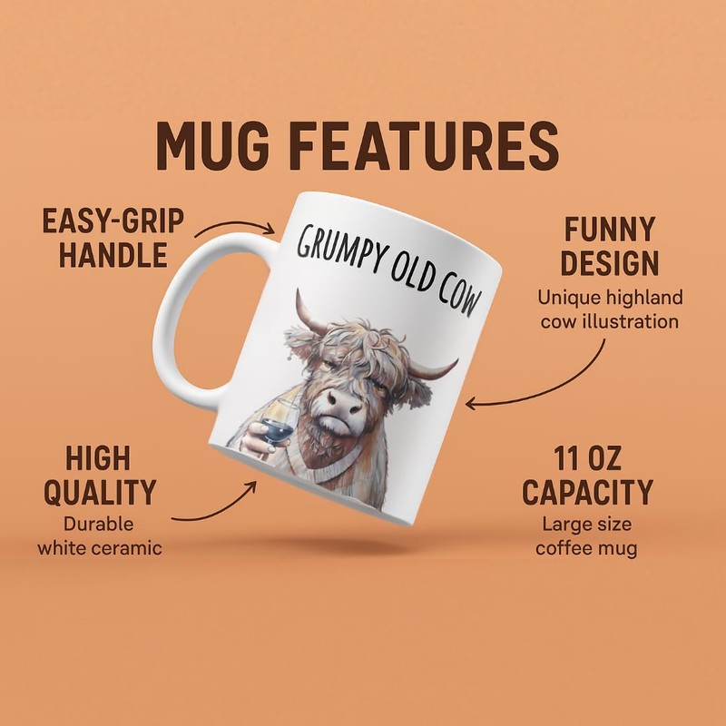 - 🐮 Hilariously Grumpy Highland Cow – Not your average Highland cow stuffed animal, this mug features a detailed illustration of a wine-loving, moody cow ready to conquer your coffee routine.