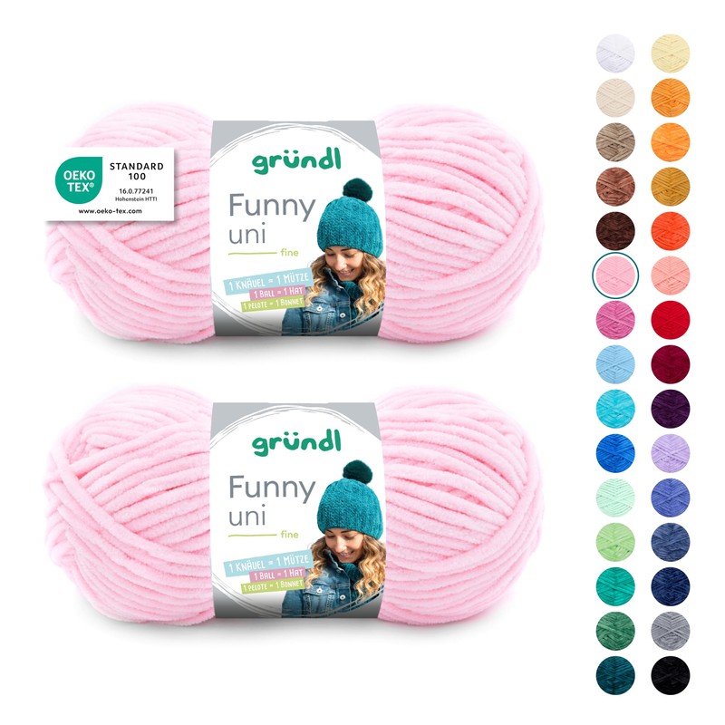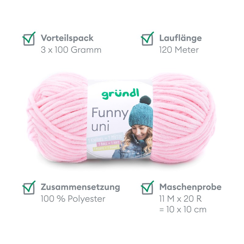 - Box contents and other features: Gründl Funny plain wool, 2 x 100 g / 100% polyester / tension sample: 11 m x 20 R = 10 x 10 cm / material consumption: jumper (size 38) = approx. 500 g