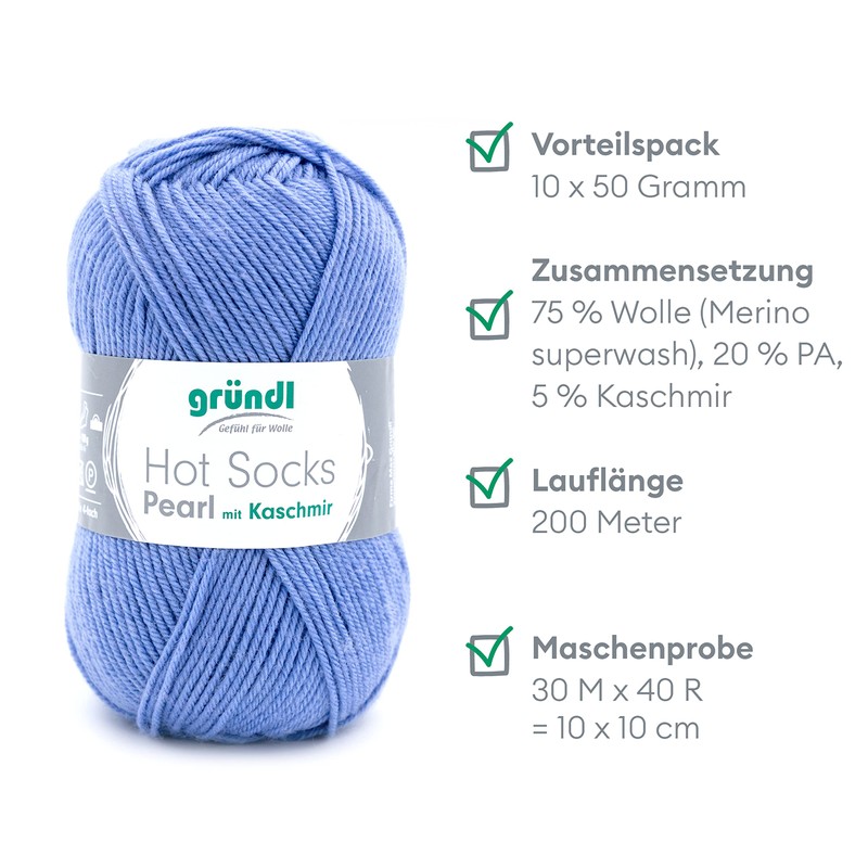 - Box contents and other features: Gründl Hot Socks Pearl plain, 10 x 50 g / 75% merino wool, 20% polyamide, 5% cashmere. Tension sample: 30 m x 40 R = 10 x 10 cm. Material consumption: jumper (size 38) = approx. 500 g, one pair of socks = approx. 100g
